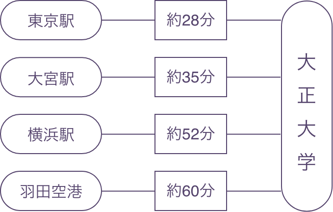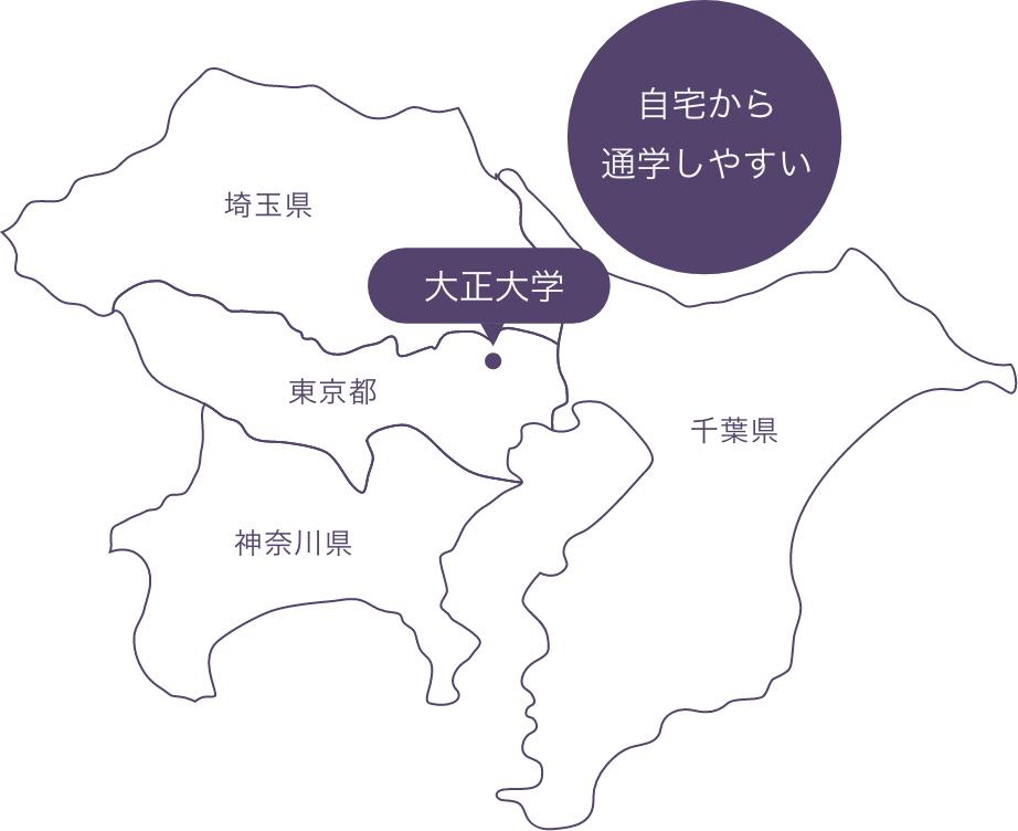 大正大学は、西巣鴨駅、板橋駅、池袋駅など、近郊からのアクセスがよく、実際に一都三県からの出願者が7割以上。「自宅から通いやすい」という点からも経済的な負担が少なく学べる環境です。