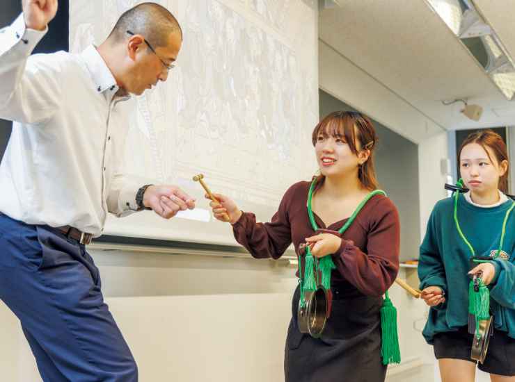 時宗の開祖・一遍上人が布教のために行った「踊り念仏」。正確な所作は記録に残っておらず、絵巻物や口伝を手がかりに、鐘の叩き方や歩き方を考察しました。まだ解明されていないことも、自ら考え、実際にやってみることで、見えてくるものがあると実感。その時代や土地の風土も感じながら、文化遺産に触れていきたいです。