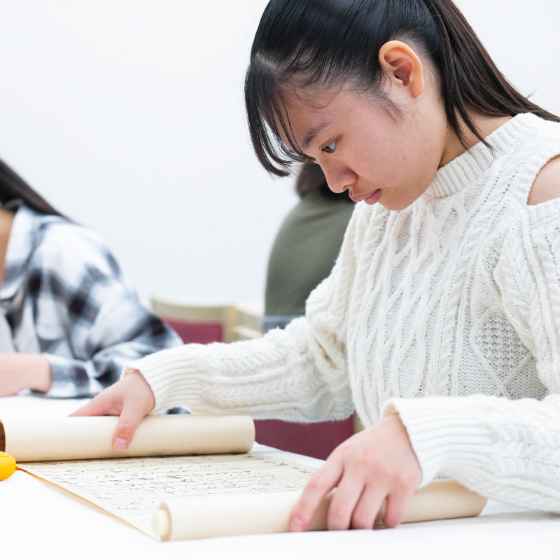 高校時代から興味のあった古典を学びたくて入学しましたが、「和本」に触れたり「くずし字」の読解方法を学んだり、初めての経験を楽しむ中で、改めて”言葉”の面白さに気がつきました。今後の目標は「日本語学」をさらに探究して、教育現場の改善に貢献すること。自分では意図していなかった体験が、新たな世界へと導いてくれました。