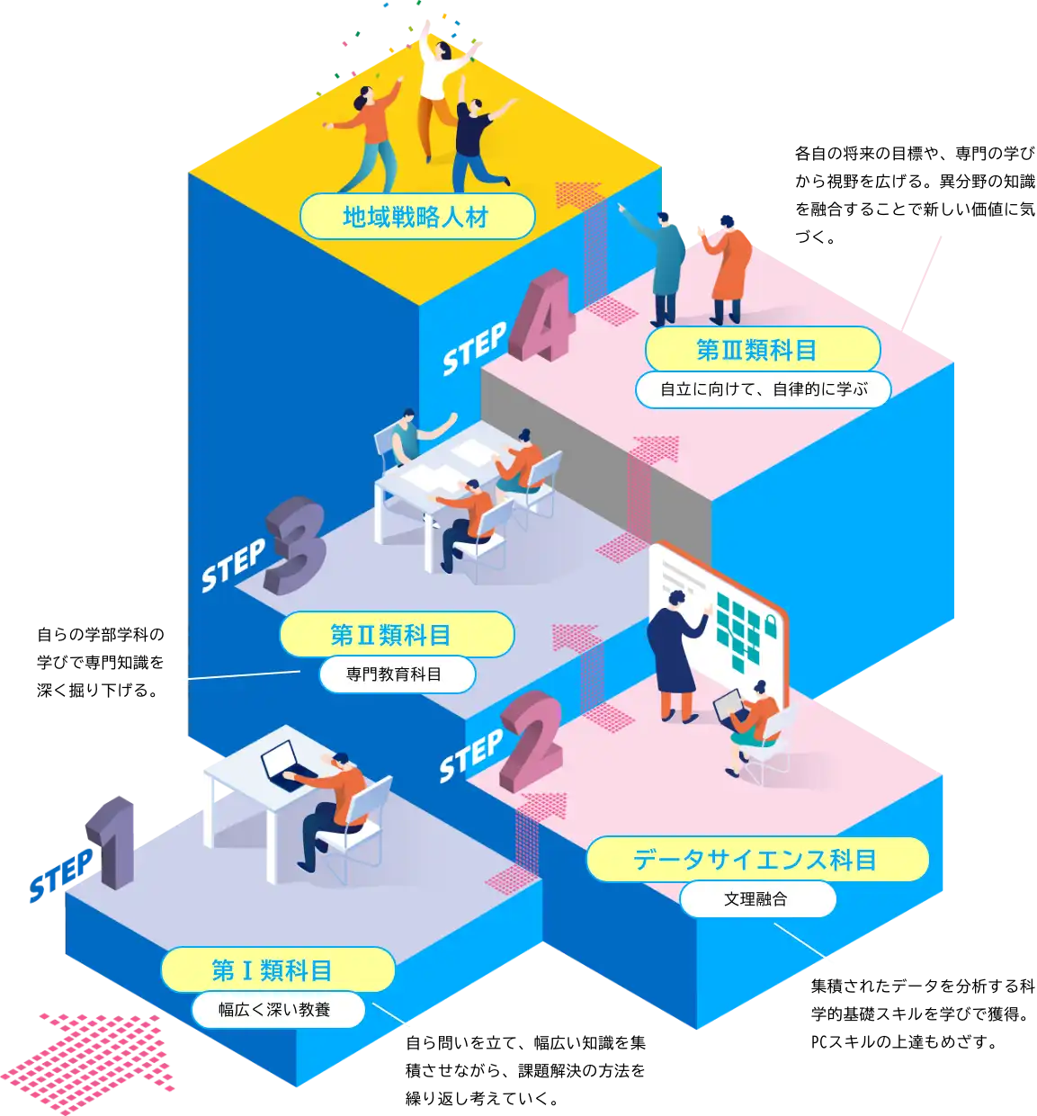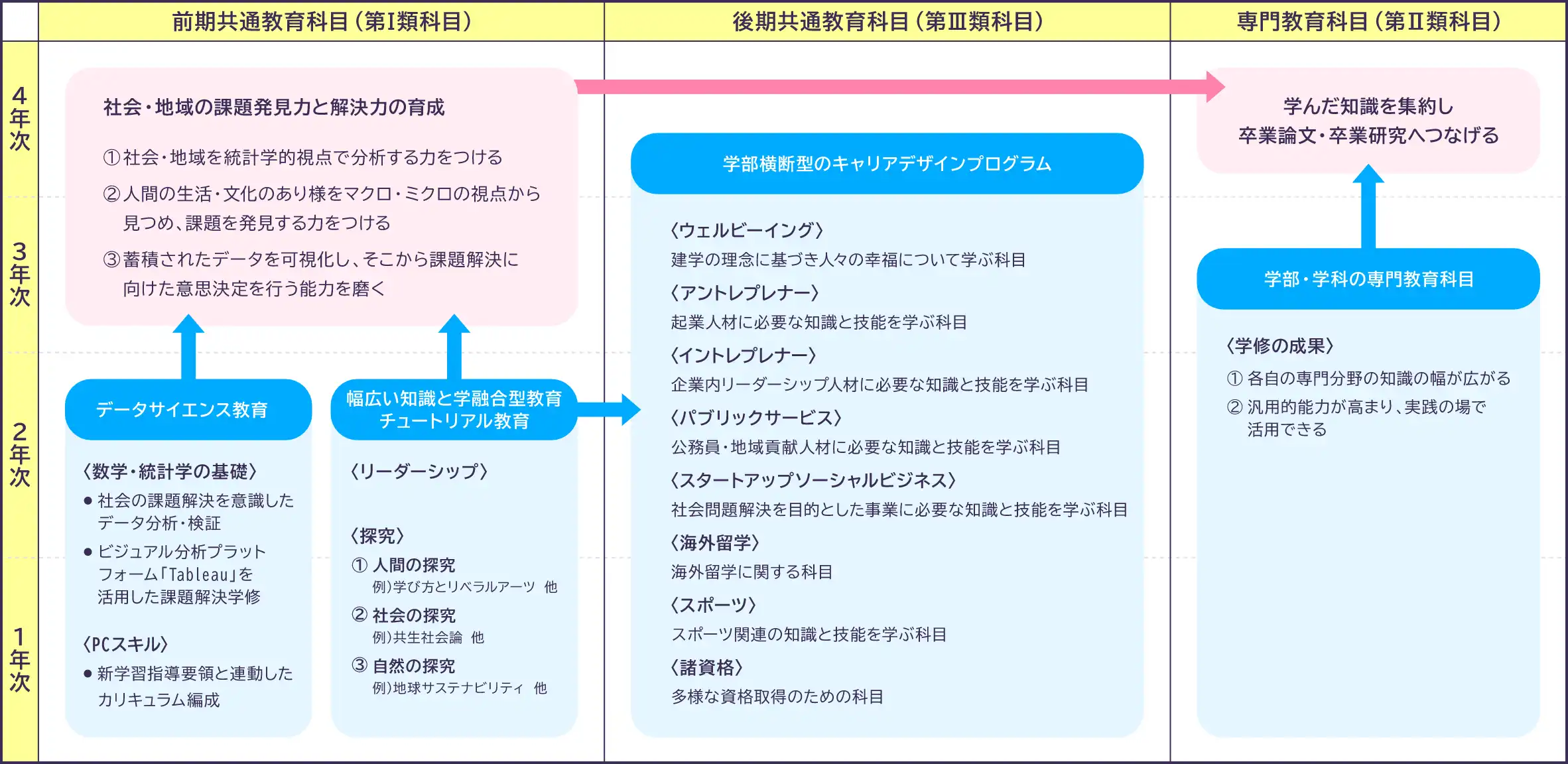 基礎(知識習得)→応用(スキル習得)→融合・実践(リアルな経験)の流れで段階的に成長し、多様なキャリアの可能性を広げることができます。