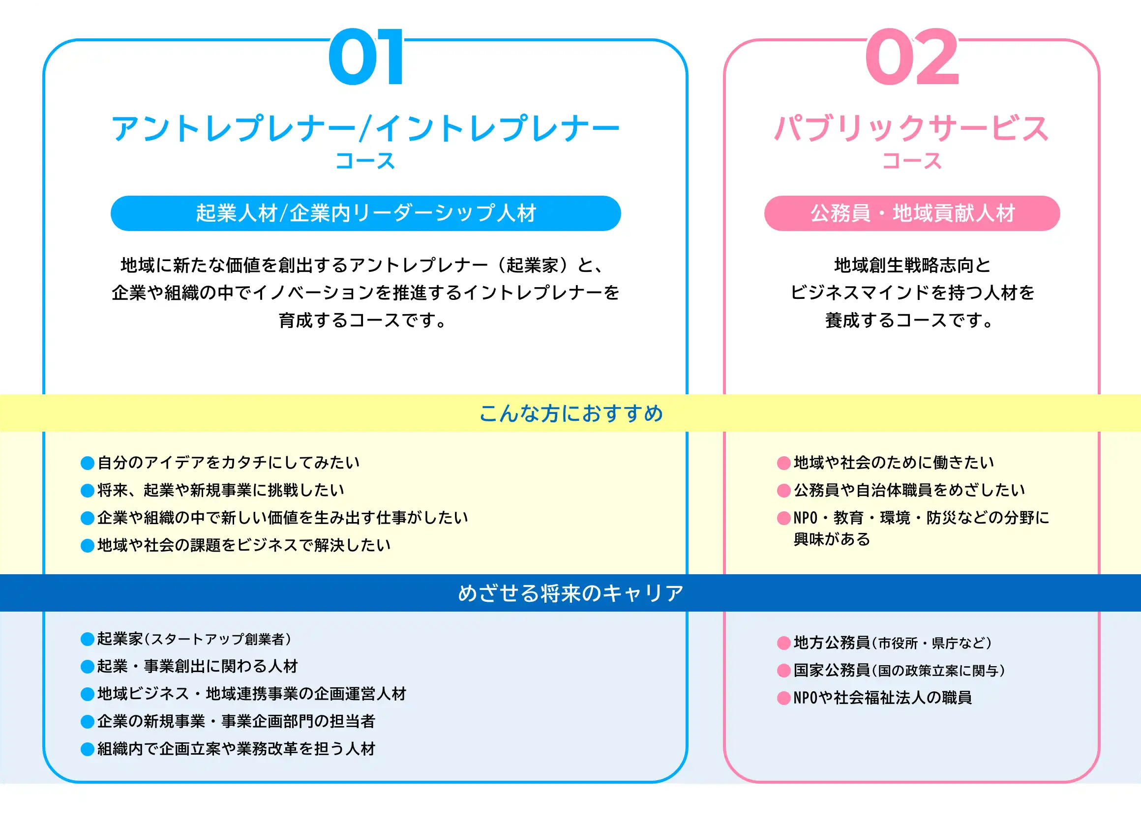 学生自身のキャリアビジョンに応じた2つのコースを設定しています。各コースでは、キャリアビジョンの方向性に沿ったカリキュラムを用意。