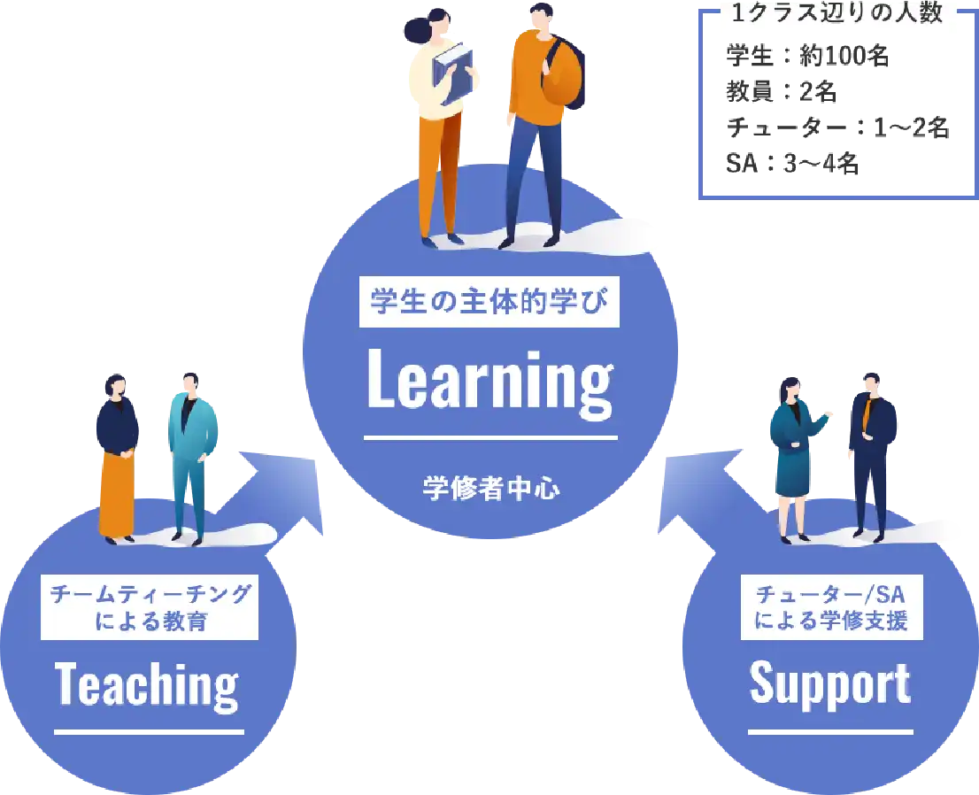 文系大学の学生が数理・データサイエンス・AIに関する知識・技能を適切に活用する力を身につけ、不安なく自らの意志で利活用できるように、教員・チューター・SAによるチュートリアル教育を実施し、授業内外で学修を支援しています。