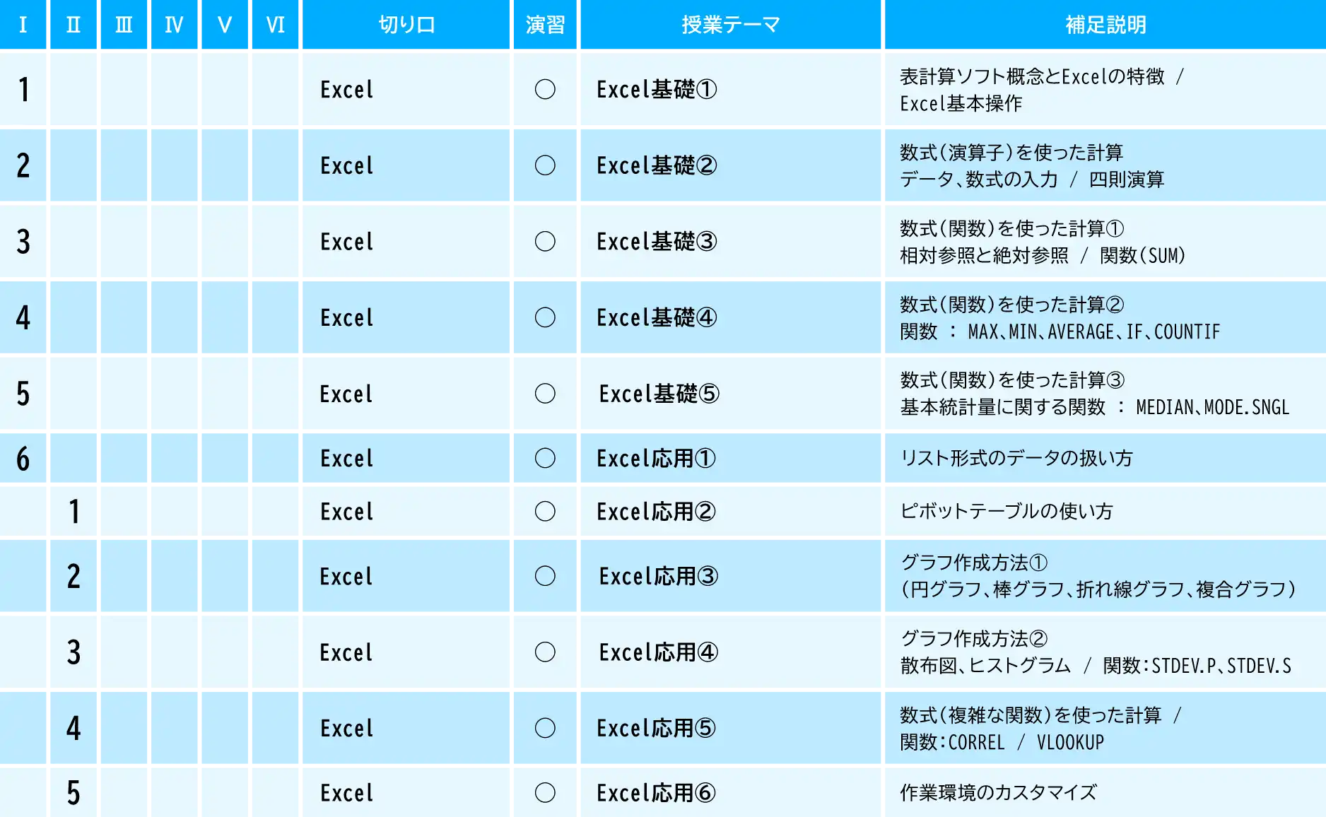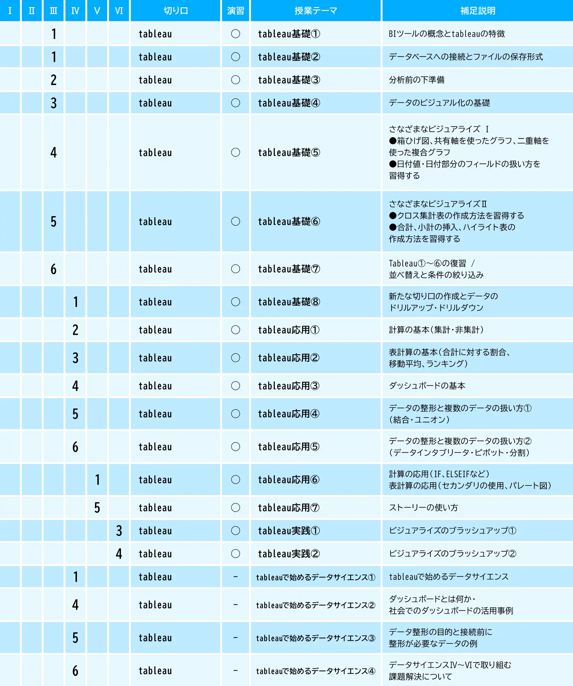 ①統計の基本に基づき ②データを使った課題解決の基本的なステップ ③定量分析手法 ④情報リテラシーと情報倫理(守秘義務契約)を学んでいく。
